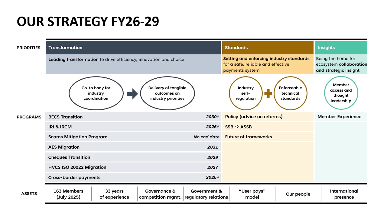 These changes are reflected in strategic shifts that are taking place at AusPayNet. Over the last three years, the primary focus of AusPayNet has shifted to facilitation and coordination of industry priorities and transformation programs. Meanwhile, AusPayNet’s role in industry self-governance continues to be important as exemplified in the development of new technical standards. With the Government’s reforms agenda picking up momentum again in 2025, it remains paramount that the industry-led model for mandatory standards is settled in 2026-27. Finally, the demand for AusPayNet insights and thought leadership continues to rise with growing membership from a diverse set of industry participants, particularly non-major ADIs and fintechs.